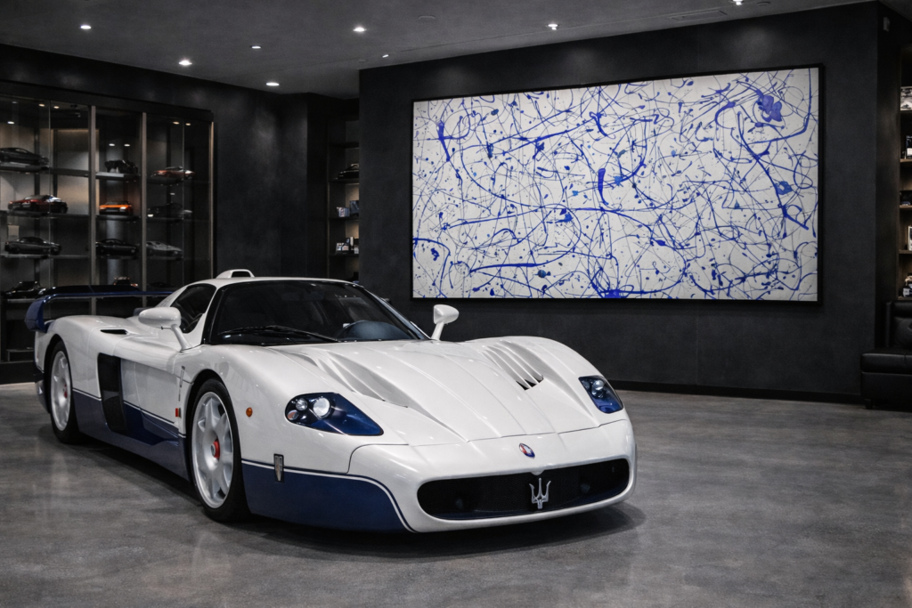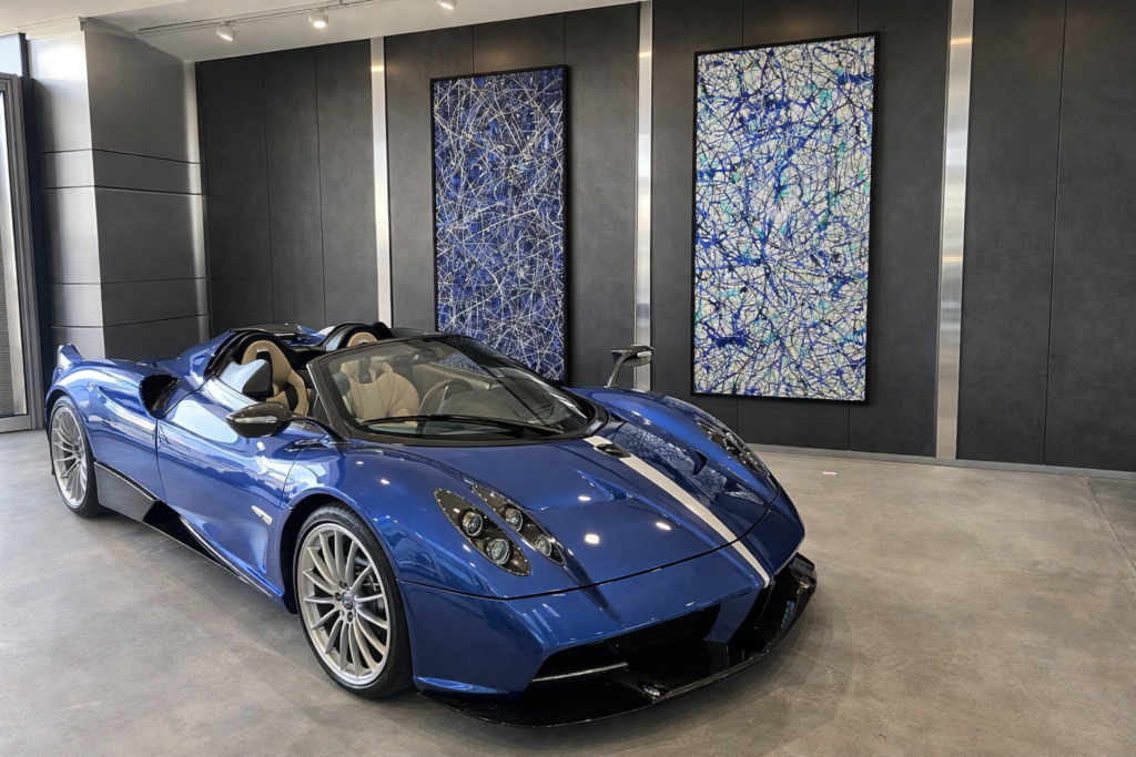 Placed within a luxury garage, abstract artworks can amplify the visual language of the vehicles around them.