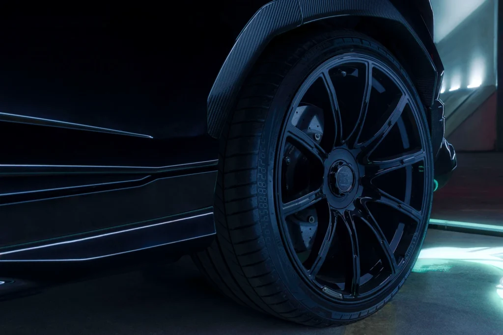 The wheels are paired with high-performance tires measuring 295/30 ZR24 at the front and 345/25 ZR24 at the rear, ensuring optimal grip and stability even at very high speeds.
