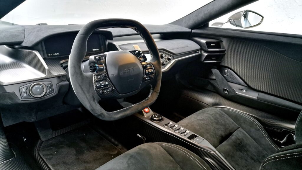 Inside, the Ford GT continues its focus on performance. The cabin is designed around the driver, with a minimalist layout that emphasizes clarity and control.